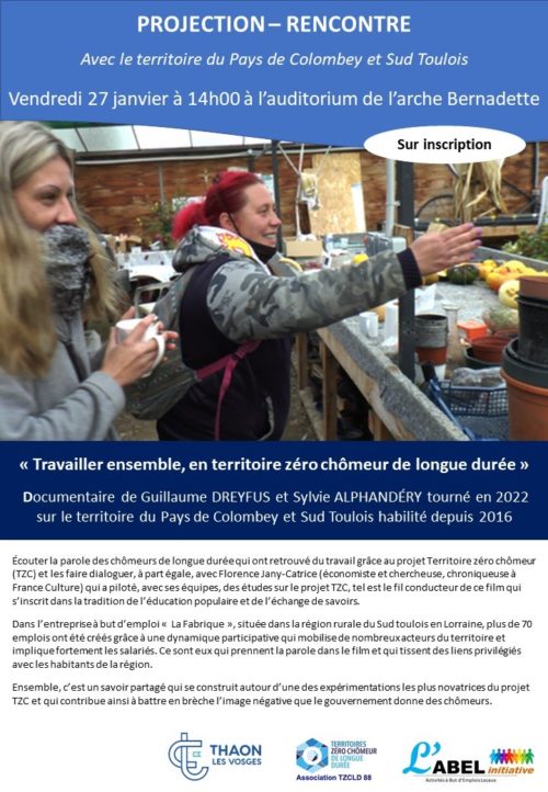 Vendredi 27 janvier à 14h à l’auditorium Clémentine Delait (Arche Bernadette), venez découvrir le documentaire Travailler ensemble, en territoire zéro chômeur de longue durée de Guillaume Dreyfus et Sylvie Alphandéry tourné en 2022 sur le territoire du Pays de Colombey et Sud Toulois habilité depuis 2016.